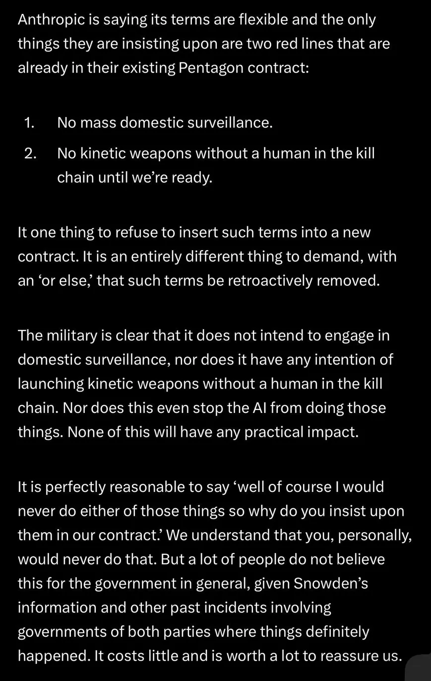 Anthropic was also the first AI company to deploy models in classified government networks, the first at the National Laboratories, and the first to offer custom models for national security customers. The company has also proactively cut off CCP-linked firms and shut down CCP-sponsored cyberattacks targeting Claude — foregoing several hundred million dollars in revenue in the process. This is not a company hostile to national security. It is a company drawing two specific lines.