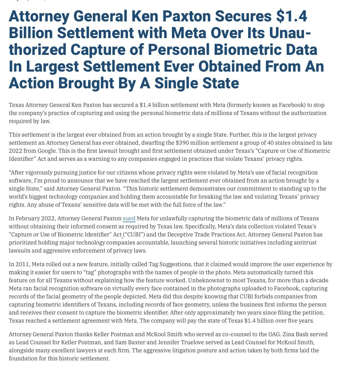 In recent years, the Texas Attorney General has taken a more active role in enforcing CUBI. Notable cases include actions against major tech companies like Google and Meta, alleging violations of CUBI and the Texas Deceptive Trade Practices Act (DPTA)[3][5].