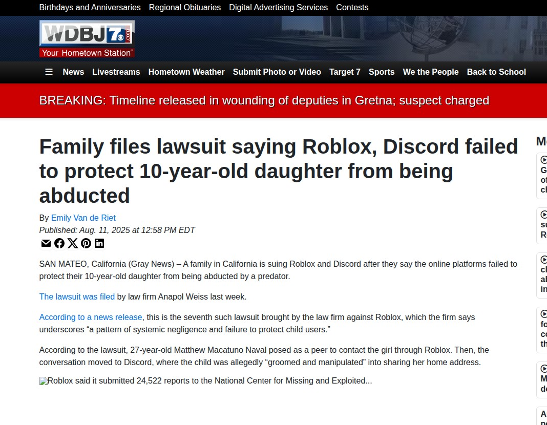 May 2025 - California Kidnapping Case: A 13-year-old girl was groomed, kidnapped, and raped by a predator she met on Roblox. The family filed a lawsuit against Roblox for negligence, claiming the platform failed to protect their daughter.