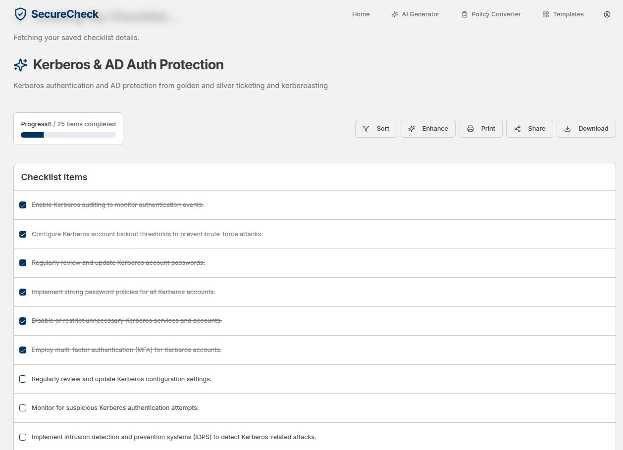 Creating a checklist is just the beginning. SecureCheck's progress tracking system transforms static lists into dynamic security improvement programs. Features include: