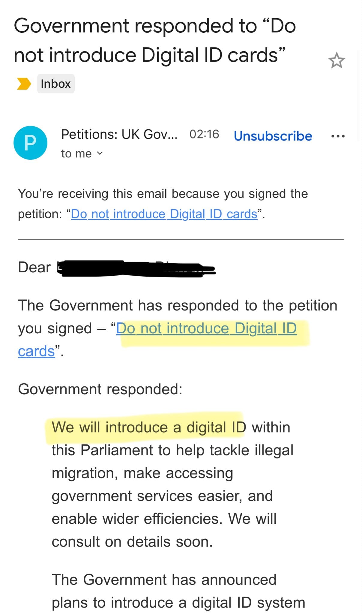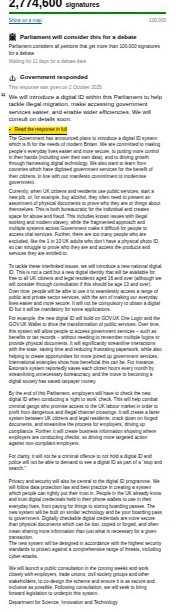 Over 2.76 million people signed a petition demanding the government not introduce digital ID cards. On October 2, 2025, the government responded by stating: "We will introduce a digital ID within this Parliament to help tackle illegal migration, make accessing government services easier, and enable wider efficiencies."